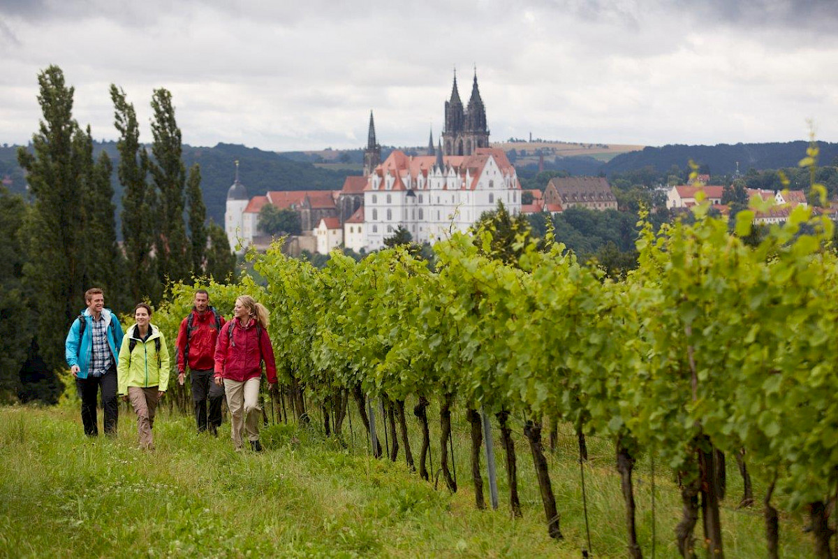 Am Schloss Seußlitz angekommen, lohnt ein kurzer Abstecher in den romantischen Landschaftspark am Schloss Seußlitz und in die von George Bähr errichteten Schlosskirche. Der Einstieg in den Sächsischen Weinwanderweg führt über die Heinrichsburg vorbei an den restaurierten Sandsteinfiguren der Jahreszeiten direkt in die Weinberge. Über Radewitz und Löbsal gelangen Sie in den Golkwald. Schon von Ferne grüßt der Kirchturm von Zadel. Weiter führt der Weinwanderweg direkt durch die Weinberge mit Fernsicht über das Elbtal und Meißen in den kleinen Ort Proschwitz. In Proschwitz befindet sich das Schloss der Familie Prinz zur Lippe. Hier haben Sie die Möglichkeit, verschiedene Weine des Weinguts Prinz zur Lippe – Schloss Proschwitz in der Vinothek im Schlosshof zu probieren. Den Landschaftspark sollten Sie auf jeden Fall besichtigen. Am Weinberghaus Proschwitz angekommen, genießen Sie die fantastische Panoramaaussicht zur gegenüber liegenden Albrechtsburg, über das Spaargebirge und in der Ferne bis nach Dresden. Über die Katzenstufen steigen Sie hinab in das Elbtal, folgen dem Ufer der Elbe und erreichen wenig später Meißen. Übernachtung in Meißen